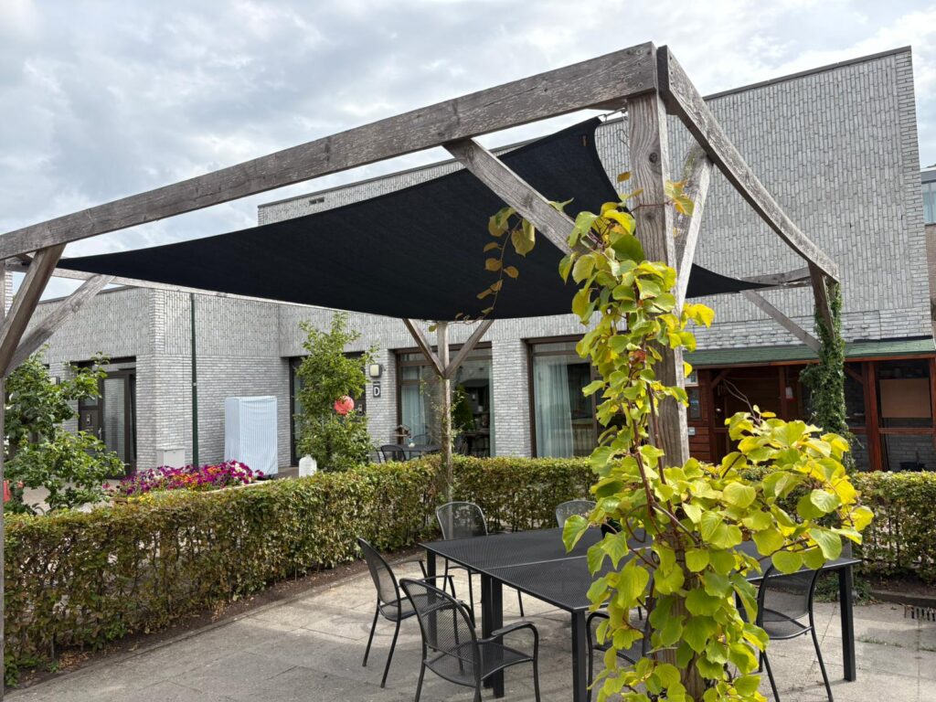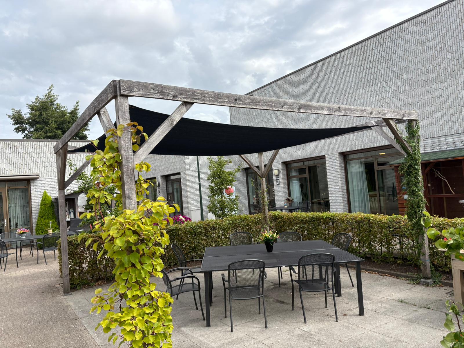 In de binnentuin hebben we deze zomer een nieuw schaduwdoek opgehangen. Nu kunnen alle bewoners weer, samen met familie en mantelzorgers, heerlijk in de schaduw van de tuin genieten.